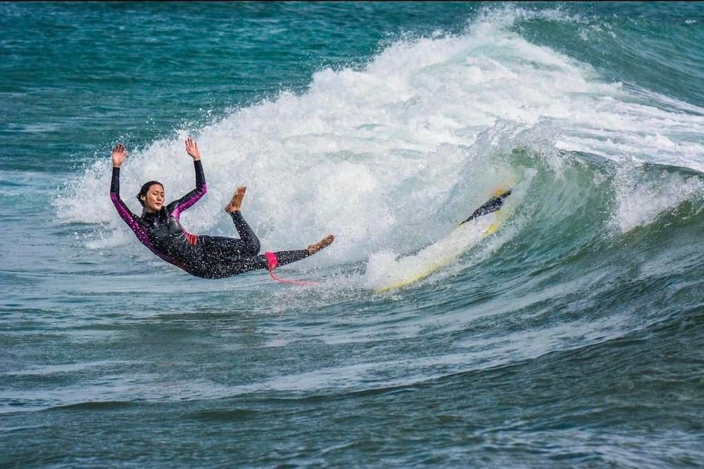 Also, be in a protective position right before you sense a wipeout. This position involves shielding your head with your arms so that even if the board hits you, you don’t sustain head injuries or, worse, aren’t knocked unconscious, which can lead to drowning.Â