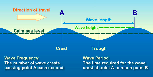 The anatomy of an ocean wave. The crest and trough can be seen at points A and B, along with definitions of the wave frequency and period.